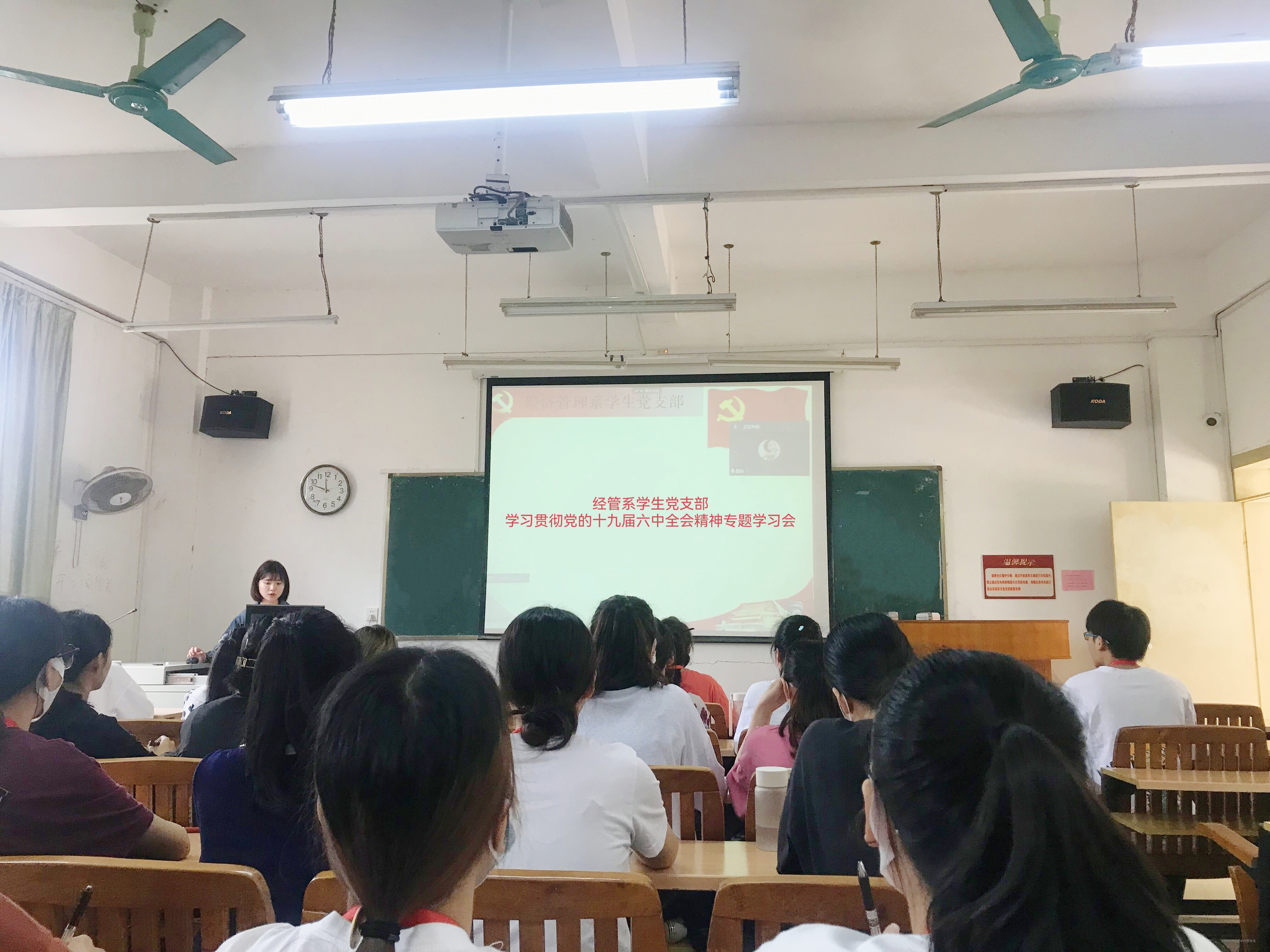 4月12日中午,经管系学生党支部在教学楼4-101教室召开学习贯彻党的十九届六中全会精神专题学习会。经管系党支部书记朱佳宁及全体在校党员参加会议。
