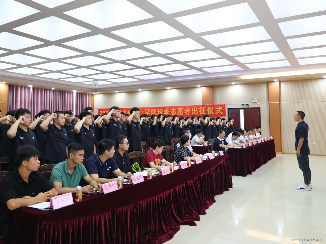 活动伊始,大家一同观看了姚基金创始人姚明为出征志愿者们精心录制的寄语视频,我院志愿者深受鼓舞、倍感振奋。学院党委副书记、常务副院长李剑喜致欢迎辞。他首先向莅临本次活动的领导嘉宾表示欢迎和感谢,并指出我院是姚基金广西片区唯一合作高校,自2015年正式与姚基金结缘来,我院先后向广西区内外乡村地区输送了479名志愿者,受到姚基金、当地学校及社会各界的高度评价。为进一步促进乡村振兴,今年我院将再次选派57名姚基金志愿者奔赴一线,帮助乡村地区缓解体育教育师资匮乏、体育教学落后、体育活动缺失等问题尽一份力,促进乡村地区青少年德智体美劳全面发展。此外李剑喜常务副院长还向志愿者们提出了三点要求:一是以“以体育人,向新而行”的全新工作理念为指导,坚持体育和教育的有机融合,服务乡村体育教育振兴;二是坚持“高度热忱,无私奉献”的志愿服务精神致力于助学兴教,促进青少年健康发展;三是将“尚美笃行,厚德博学”的师园校训融入到支教实践的全过程中。