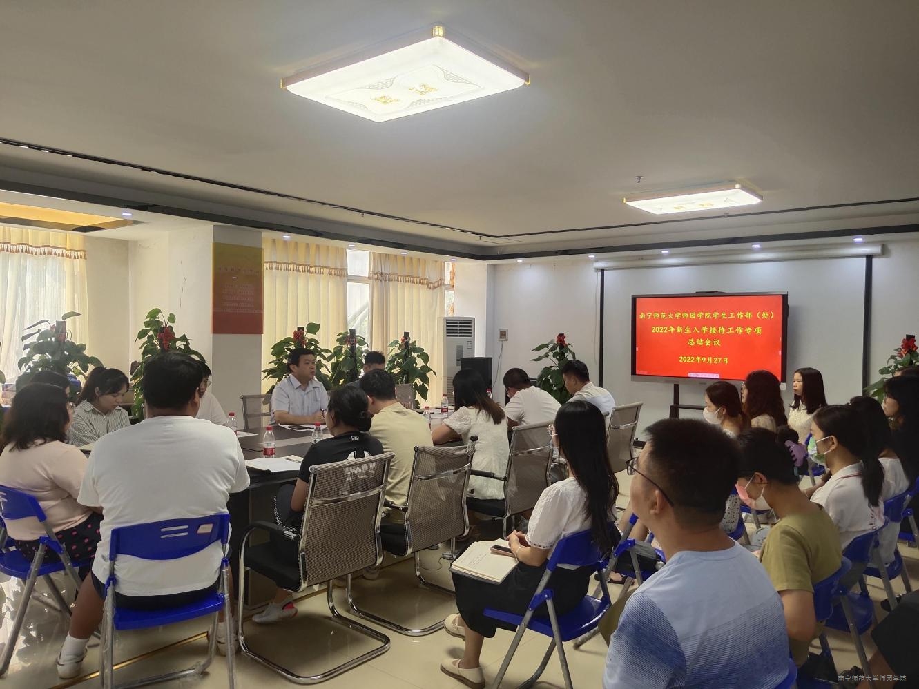 党委副书记、常务副院长李剑喜在会上作重要讲话。他首先对本次新生接待工作以及所有工作人员的付出给予了高度赞扬和肯定,围绕新生入学教育、军训期间新生管理、宿舍网格化管理等重点工作进行了部署,并提出了三个方面工作要求:一是全体人员要提高政治站位,高度重视学生管理,做好新生安全稳定月的各项工作,统筹安排好师生防诈骗教育、心理健康教育、军训、学生资助和学院章程及相关制度学习等,做到底数清、情况明、措施得当。二是要明确思路,理清工作方向,做好重点学生的摸排工作,严抓学生晚归情况,始终把学生的安全抓在第一位。三是要压实责任,履职尽责,将责任落实到个人,全体人员要树牢责任意识,全身心投入工作,做到政治强、业务精、纪律严、作风正,确保2022级新生入学后各项工作圆满完成。