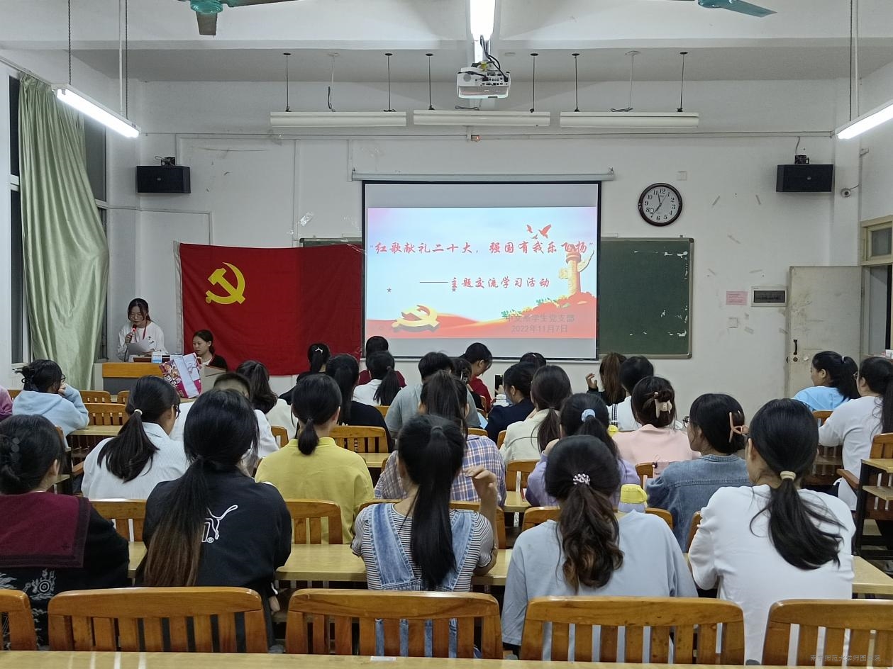 为激发学生爱国主义精神,营造健康向上的良好气氛,讴歌党的丰功伟绩,加强党支部建设,11月7日晚,中文系学生党支部在教学楼4-403教室组织开展了“我想唱歌给党听”主题交流活动。中文系学生党支部全体在校生参加活动。
