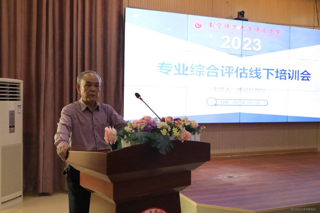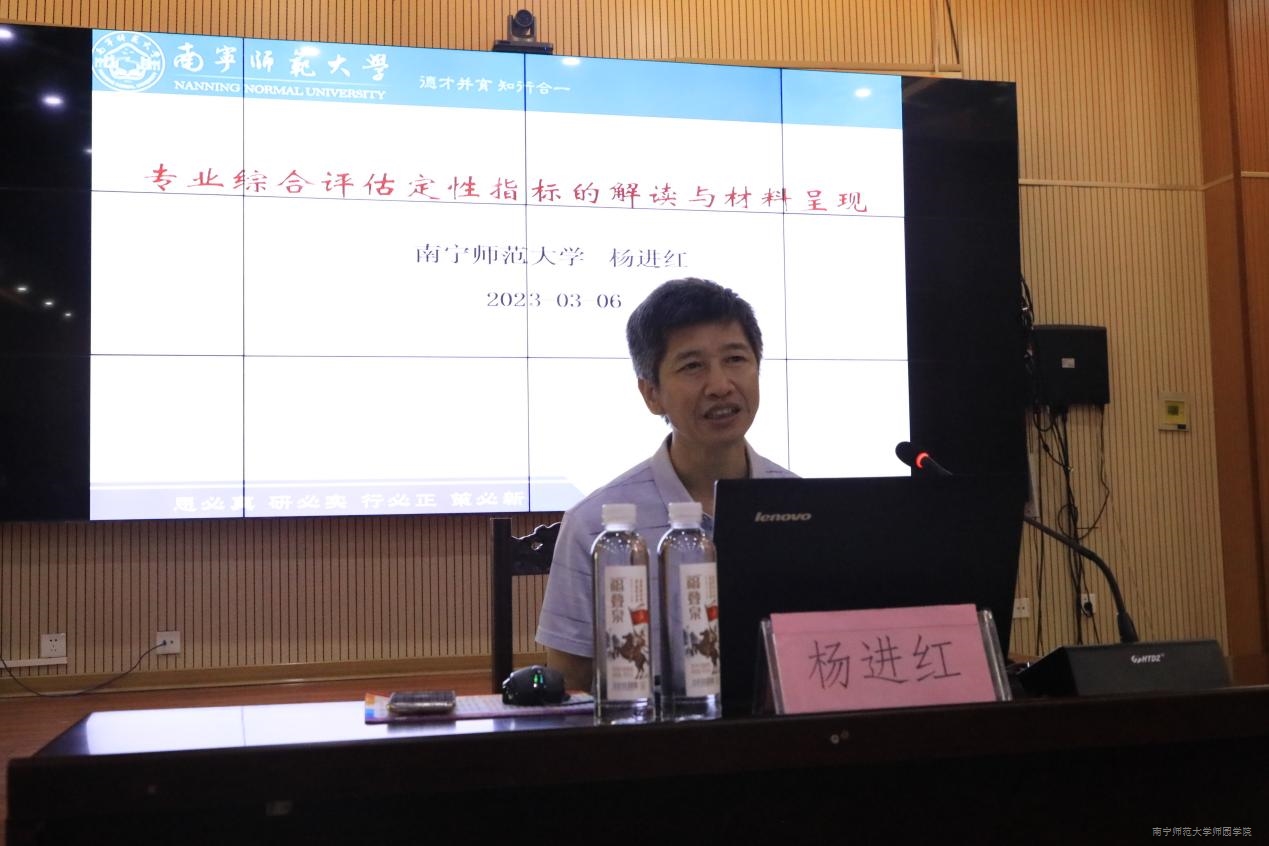 当天上午,杨进红教授作了《专业综合评估定性指标的解读与材料呈现》专题培训。他全面深刻剖析了各高校在第一批、第二批本科专业综合评估工作中存在的典型问题,并指出专业综合评估定性指标材料的呈现要强化对标意识和精准意识。杨进红教授在专题培训中还结合八个一级指标要求,从文字材料表述、数据佐证说明、支撑材料准备、材料编排要求等方面对专业综合评估定性指标的呈现作了细致讲解,帮助我院相关工作人员深入领会评估指标内涵与参加评估的方法要领。