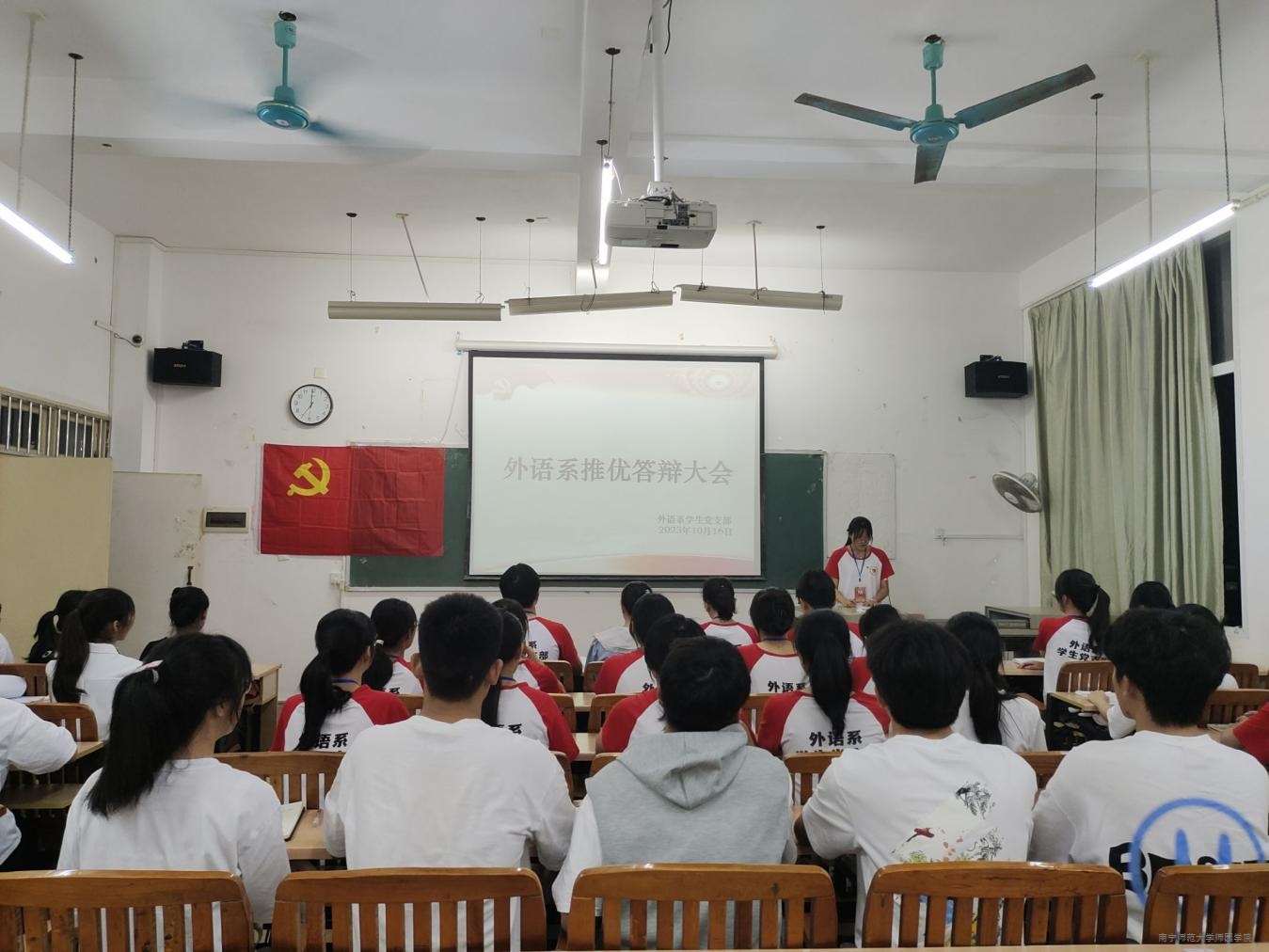 10月17日晚,外语系学生党支部在教学楼3-407教室召开2023年秋季推优入党答辩大会。外语系学生党支部书记甘心淇老师与外语系学生党支部全体学生党员、17名入党积极分子参加会议。