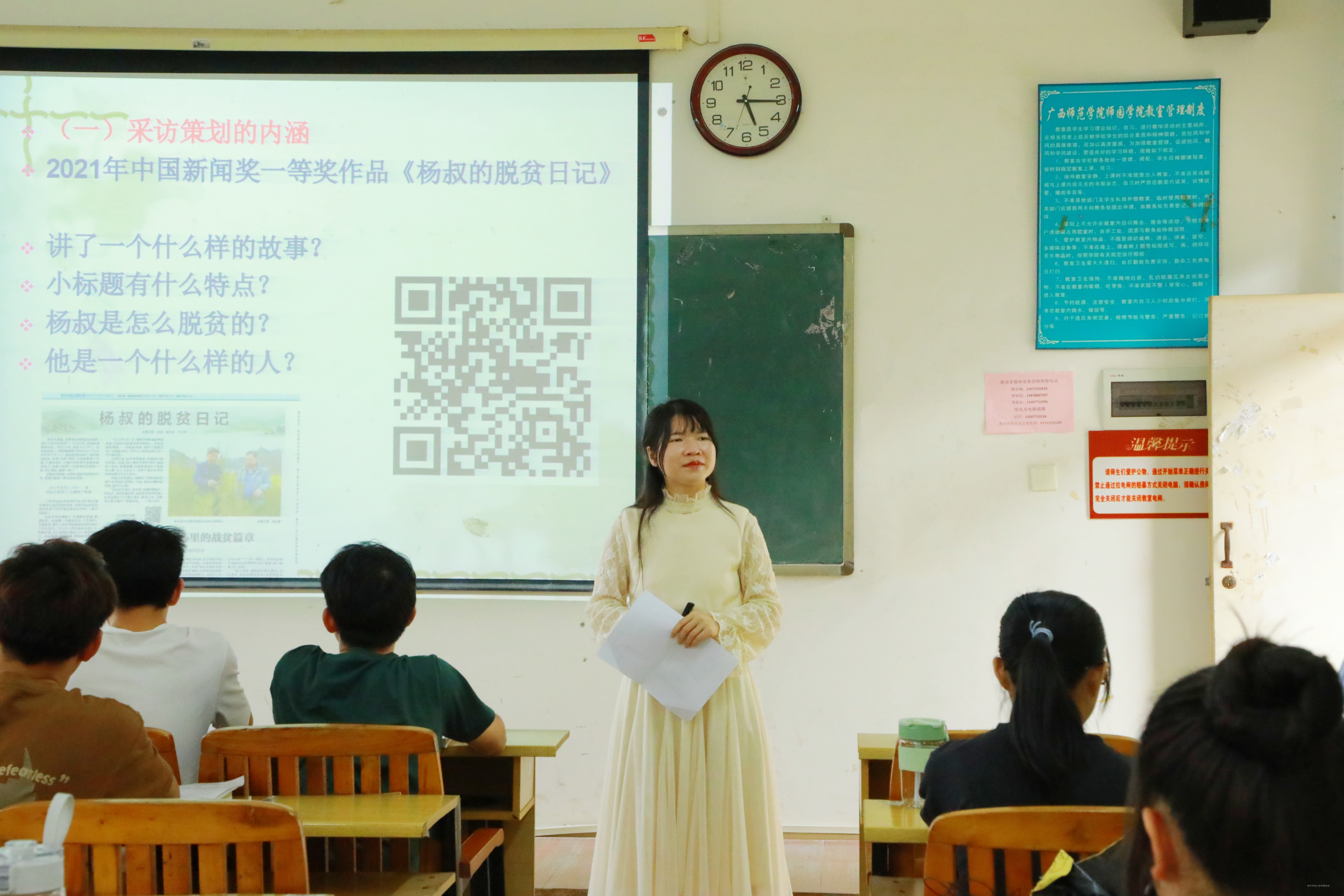 本次教学公开课由中文系专任教师黄宇鑫主讲,授课内容为《新闻选题与采访策划》。在课堂上,黄宇鑫老师通过展示2022年第24届冬季奥林匹克运动会的新闻报道截图及知名运动员和2021年中国新闻奖获奖作品《杨叔的脱贫日记》等新闻案例,引导学生了解新闻选题的定义、掌握新闻选题的实施建议、把握采访策划的定义。黄老师教学自然流畅、技巧娴熟,课程知识重难点讲解清晰,还有机地融合了课程思政元素,达到了良好的教学效果。