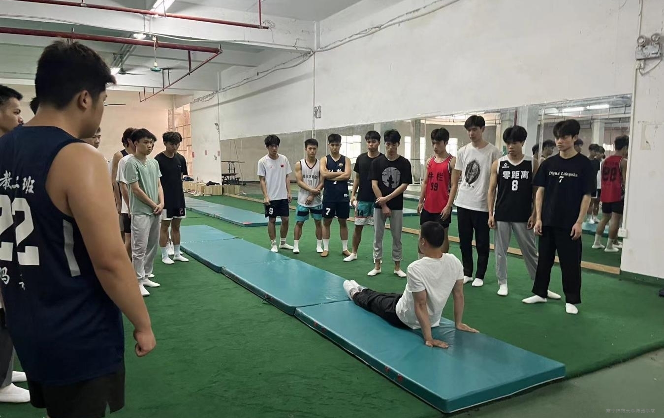 唐砚宗老师在本次观摩课的授课内容为:体操组合成套动作、经手倒立前滚翻。课堂上,唐老师首先带领学生进行热身运动,让身体得到充分地拉伸。随后,唐老师通过示范和讲解相结合的方式,生动展示了体操教学中的关键动作。此外,他还特别注重与学生的互动,让学生参与示范与练习,巩固动作技能掌握程度并调动学生的学习积极性。