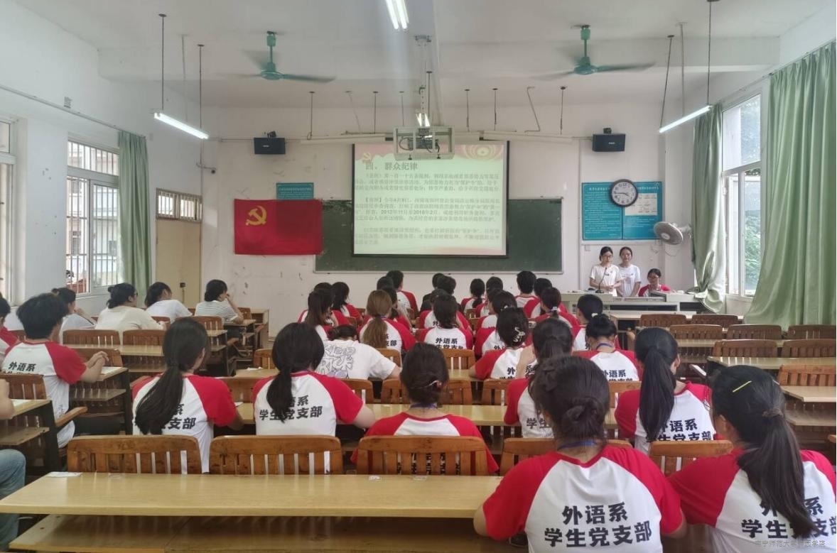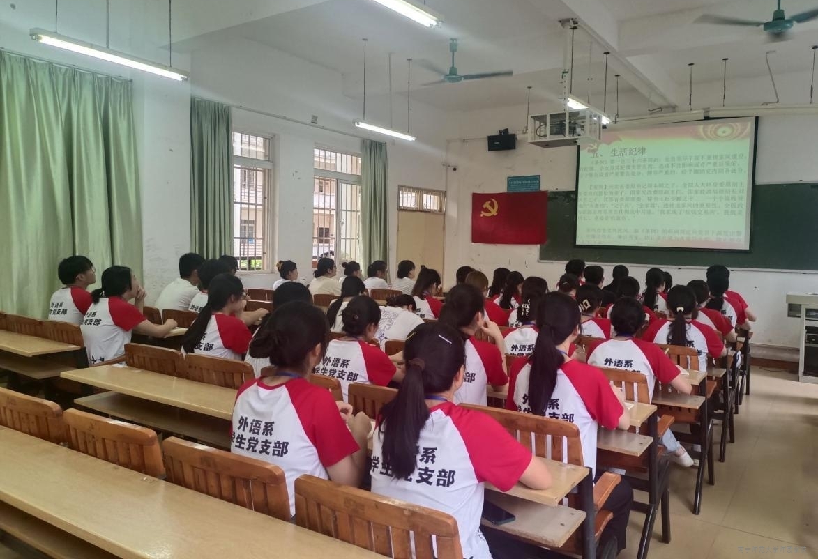 6月26日,外语系学生党支部在教学楼3-310教室召开党纪学习教育专题党课。外语系学生党支部书记甘心淇老师作《坚定信念,恪守党纪》主题授课,党支部42名同志参加党课学习。