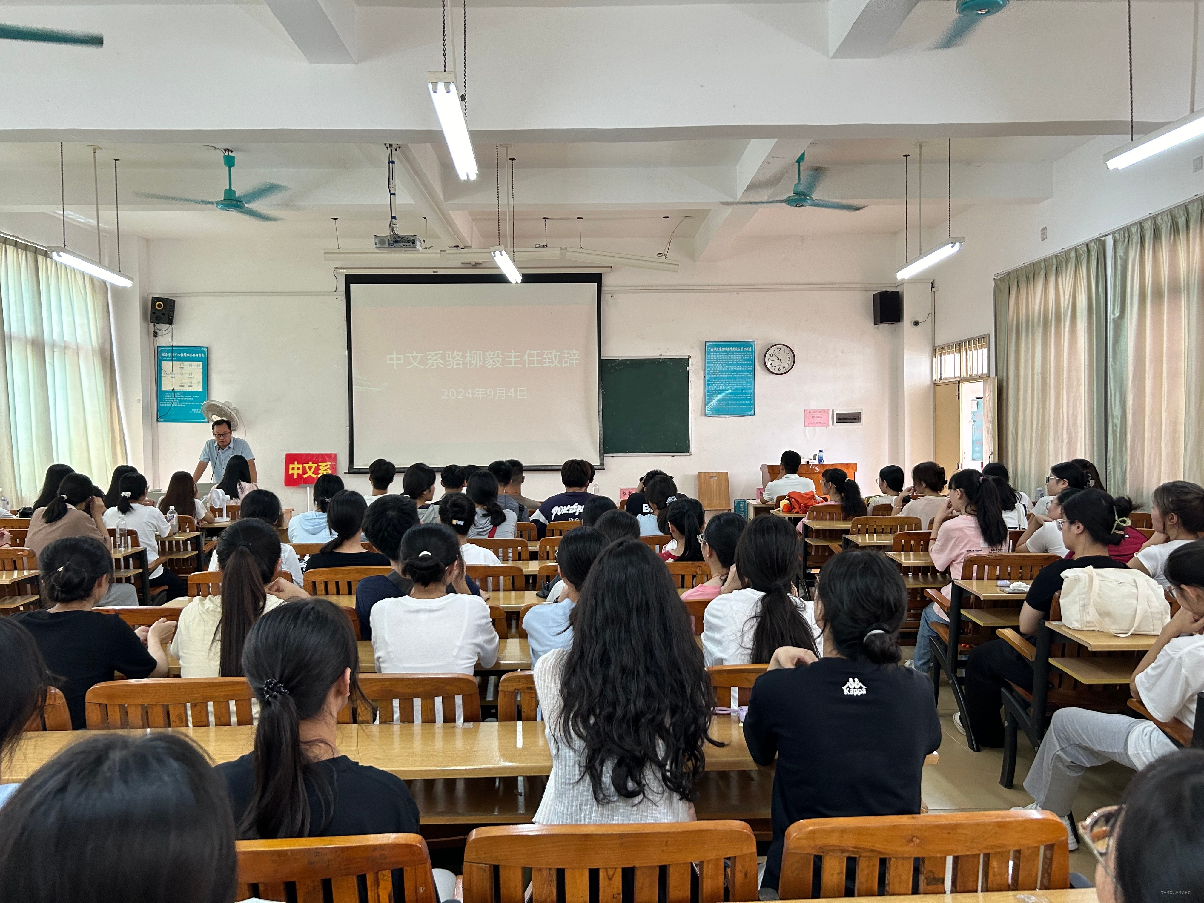 9月4日上午,中文系在教学楼3-302教室召开2024级新生入学教育大会。中文系主任骆柳毅与骨干教师黄曼婷、学工组组长韦林志、学工组副组长蒋丽娟,以及全体2024级新生参加会议。