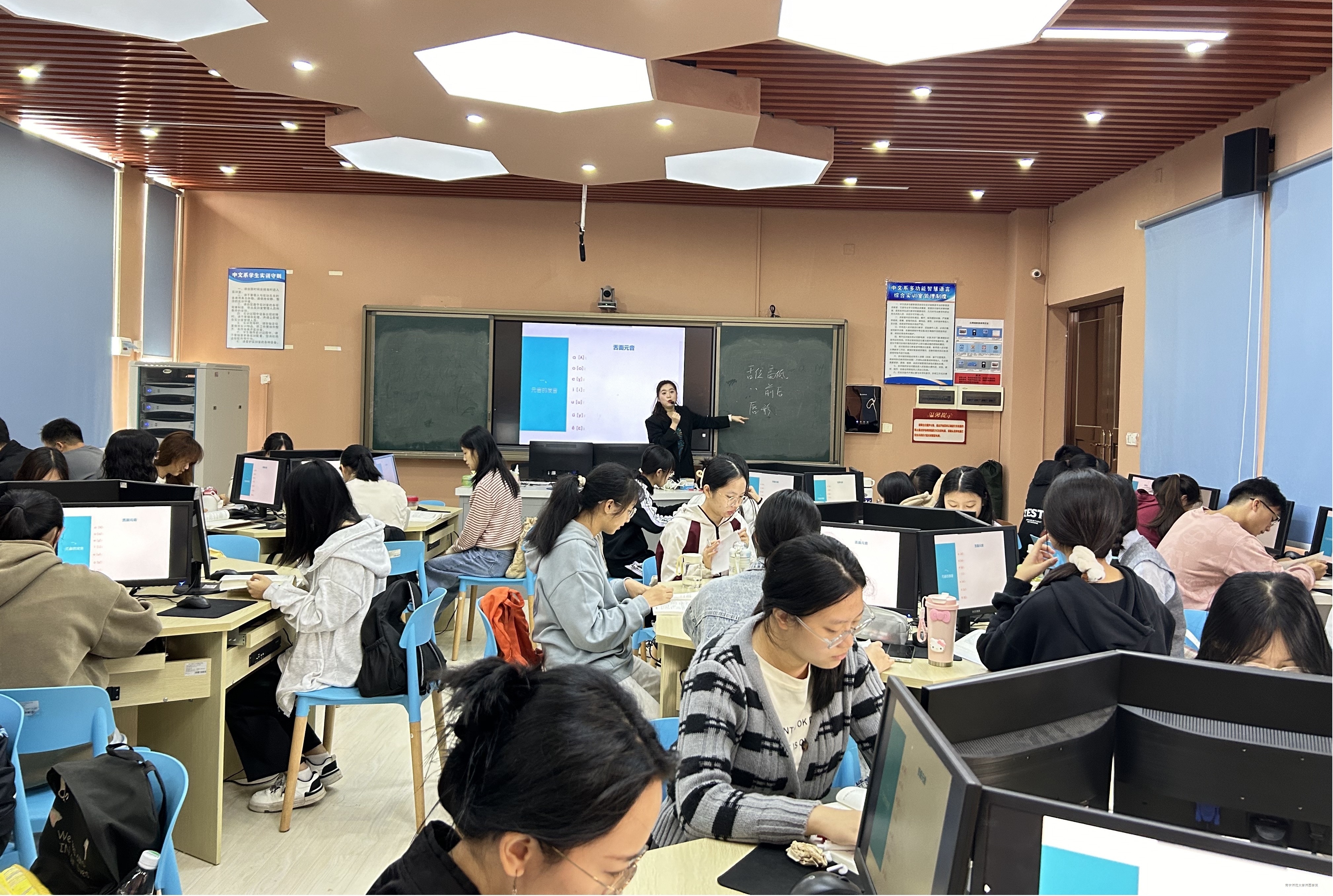 本次公开课由中文系专任教师李纯茵主讲,课程内容为《元音与韵母》。课堂伊始,李纯茵老师首先带领同学们复习了上节课的内容,通过提问方式,激发了学生们的参与热情,有效检测了同学们对《单元音韵母》知识点的掌握程度。随后,李纯茵老师通过生动的讲解和形象的展示,带领学生们深入了解了复元音与韵母的基本概念以及发音特点。在教学过程中,李纯茵老师注重通过互动环节带领学生们朗读特别词汇,感受舌位和唇形的变化和掌握自我纠正发音的方法。李纯茵老师的教学设计注重师生互动,不仅增加课堂的趣味性,让学生对语言学习产生更浓厚的兴趣,还让学生在实践中提升准确发音的能力。