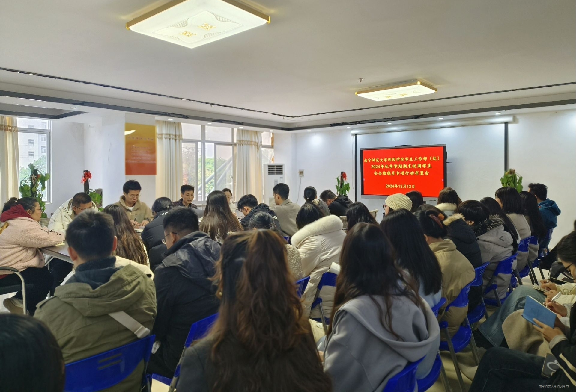 会上,叶栋处长对近期工作进行总结并就2024年秋季学期期末学生安全稳定工作重点与工作要求进行强调。一要统一思想,提高政治站位。要深刻认识到学生安全管理工作的重要性,牢固树立安全稳定责任意识,时刻保持警惕,不能有丝毫懈怠,切实增强做好校园安全稳定工作的紧迫感和责任感。二要压紧压实责任,细化工作方案。严格落实各项工作任务,坚持问题导向、目标导向、结果导向,层层压实工作责任。三要强化措施,扎实做好各项学生安全工作。要加大期末阶段学生的安全教育和加强安全管理,加强学生思想引领、校风教育、诚信教育,密切关注学生的思想动态,切实做好学期末关注重点关注人群的心理状态和思想动态工作。