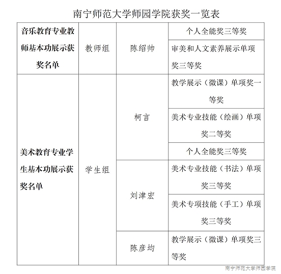 近日,自治区教育厅公布2024年广西普通高等学校音乐教育、美术教育专业学生和教师基本功展示活动获奖名单,我院艺术系声乐教师陈绍帅和2021级美术学专业学生共获8项荣誉,充分展现了我院美育教育从业、从教、从学者们的专业水平和良好精神面貌。