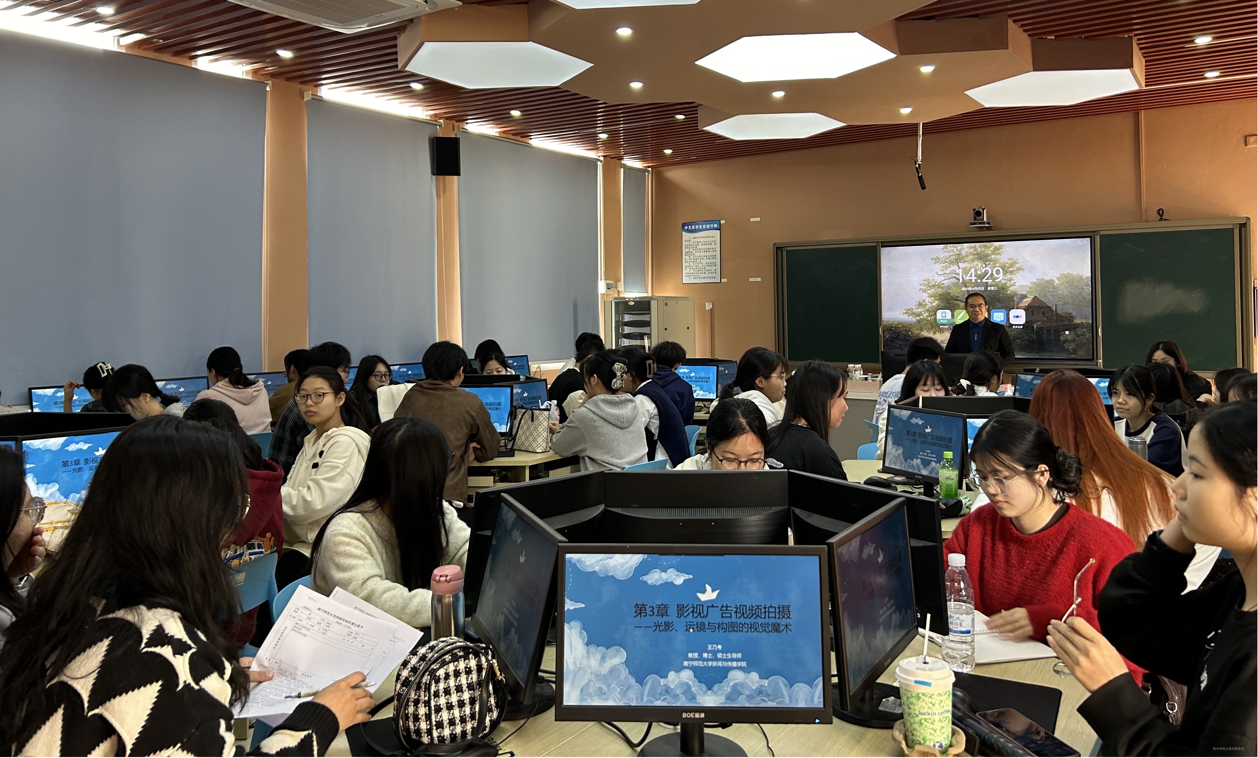 本次观摩课由王乃考教授主讲,授课课题为“影视广告视频拍摄中的光影、运镜与构图技巧”。王乃考教授将课程分为理论授课、案例分析及实践操作三个环节。课程伊始,他结合“花西子陶瓷口红广告”和“蜜雪冰城夏季广告”等案例,深入浅出地讲解了广告光影、运镜与构图的视觉魔术。另外,为了让学生深刻理解运镜力学,王乃考教授在实践环节,引导学生从身边事物或同学入手,拍摄一组推拉镜头视频,并在课堂上即时展示。课堂上,师生互动积极、学生参与性高,教学效果显著。