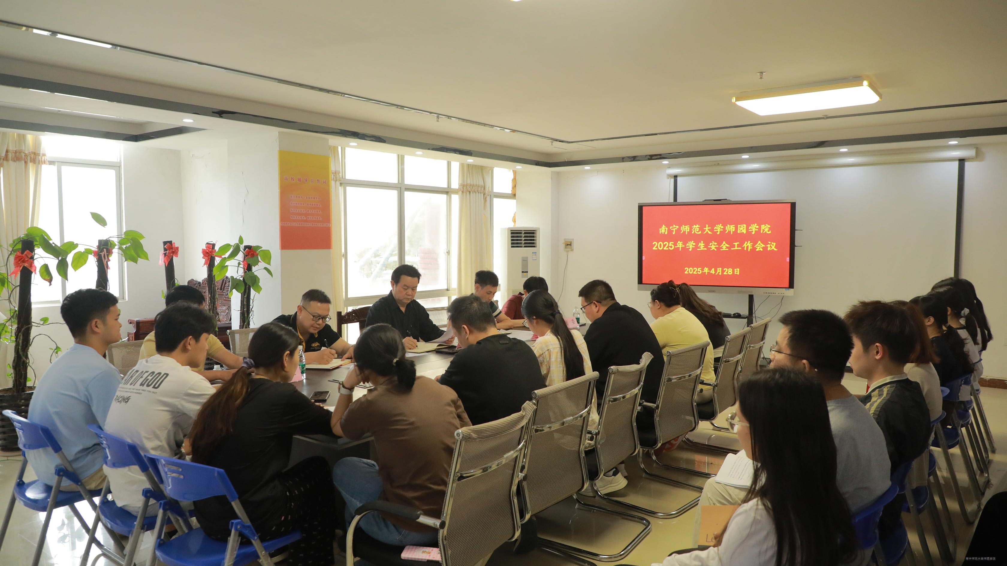 为落实自治区近日召开的“全区教育安全工作电视电话会议”会议精神,严防我院各类学生安全事件发生,筑牢校园安全防线。4月28日下午,我院在行政综合楼202会议室召开2025年春季学生安全工作会议。学院党委副书记、常务副院长李剑喜出席会议并作重要讲话,学生工作处、校团委、保卫处负责人,物业公司代表以及学工(团委)系统全体人员参加会议,会议由学生工作处长叶栋主持。