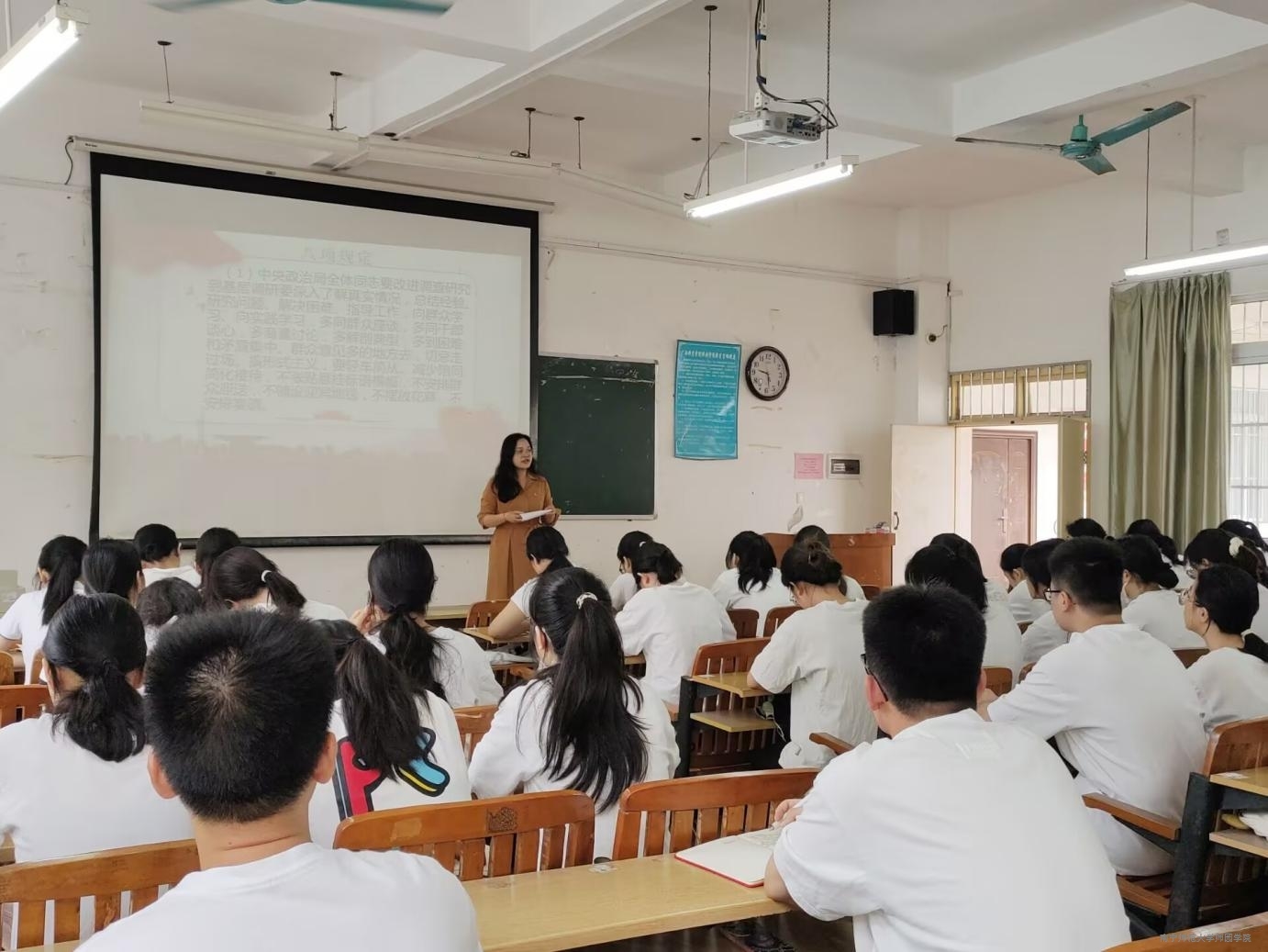 为进一步加强党风廉政建设,推动中央八项规定精神落地生根,4月25日上午,中文系党总支在教学楼3-302教室开展深入贯彻中央八项规定精神学习教育专题党课。本次党课由中文系党总支书记潘美益主讲,中文系全体师生党员参加党课学习。