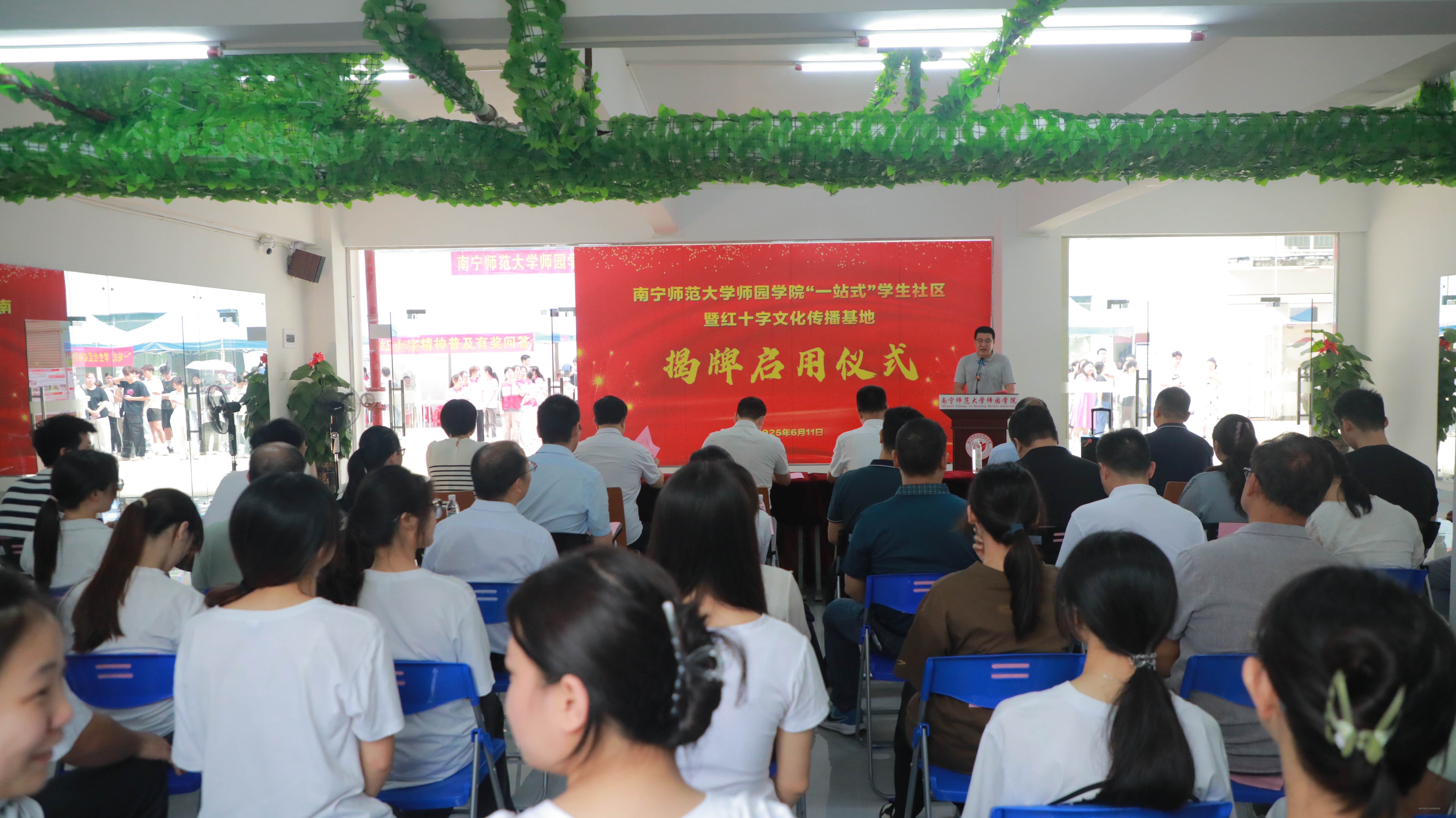 随后,学院党委副书记梁秋在仪式发表讲话。他首先代表学院,向自治区红十字会、南宁市红十字会及社会各界长期以来对我院公益教育事业的大力支持表示最诚挚的感谢,向为“一站式”社区和文化传播基地筹建和启用付出辛勤努力的师生团队致以崇高的敬意和热烈的祝贺。同时向“一站式”学生社区及红十字文化传播基地的建设与发展提出六点希望:一是必须加强党建工作的引领作用,巩固思想教育的主阵地。充分发挥社区党组织的战斗堡垒作用和党员的先锋模范作用,确保社区成为学生思想政治教育的关键阵地;二是强化部门间的协同合作,确保社区运行顺畅。各部门需明确职责、合理分工,增进沟通协调,汇聚工作合力,为社区与红十字文化传播基地的发展提供坚强保障;三是要紧密围绕学生群体的实际需求,不断优化服务供给体系。通过持续深化服务内容、创新服务模式,切实解决学生面临的紧迫、困难、忧心、期盼的问题,同时依据学生的兴趣爱好和实际需求,精心策划并开展形式多样的红十字文化活动;四是要统筹协调各方资源,深化协同育人机制。通过整合学校、家庭、社会等多方面资源,形成育人合力,全面提升青少年的综合素质和社会责任感;五是积极倡导教师投身实践,创新育人模式。广大教师应主动走出课堂、深入社区,密切关注学生生活,积极探索创新社区育人模式,提升育人质量。六是积极倡导学生融入社区,共同建设美好家园。广大学子要充分发挥主人翁精神,为社区及红十字会建设积极建言献策,共同打造优质的学习生活家园。