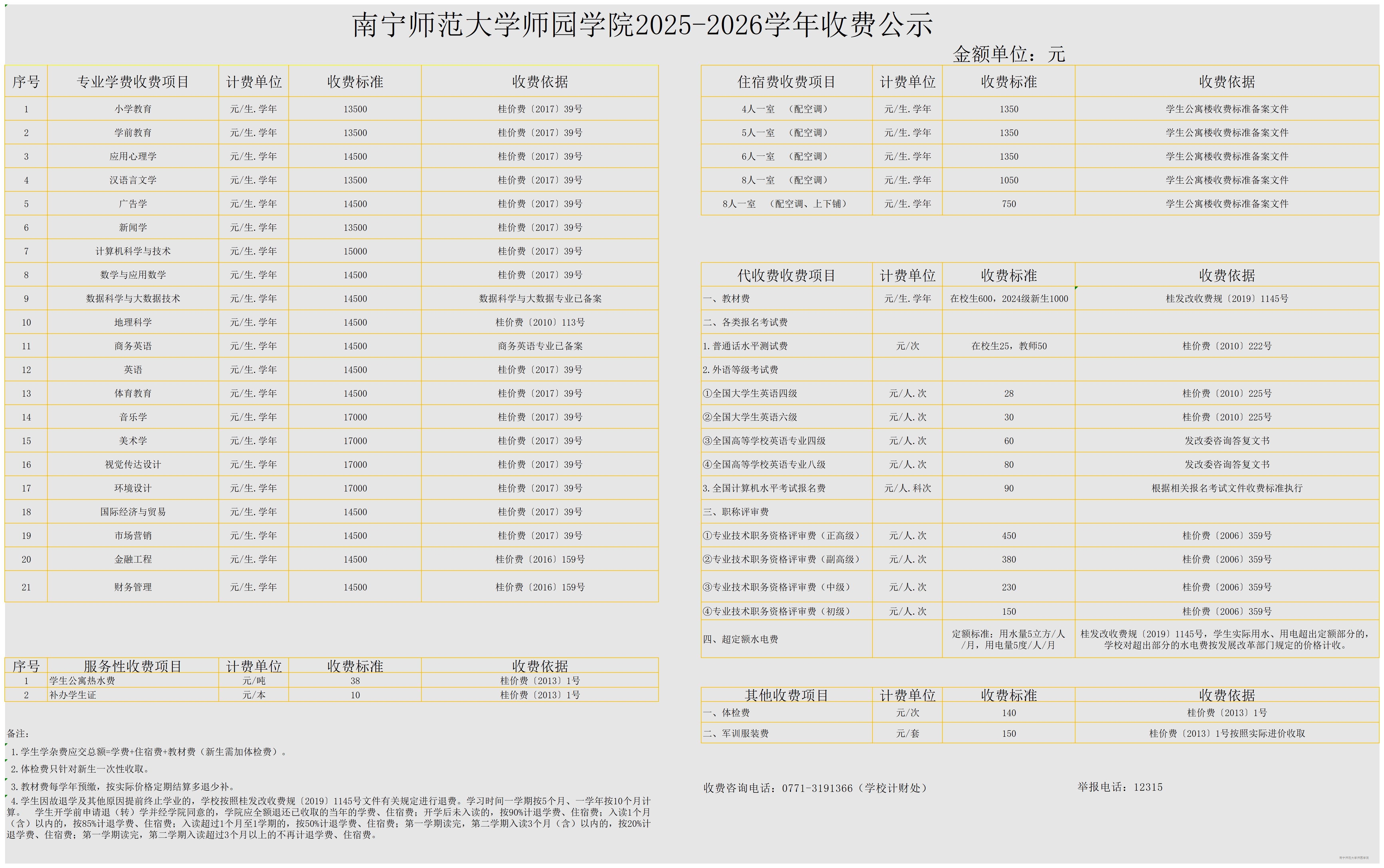 Beat365唯一官方网站2025-2026学年收费公示