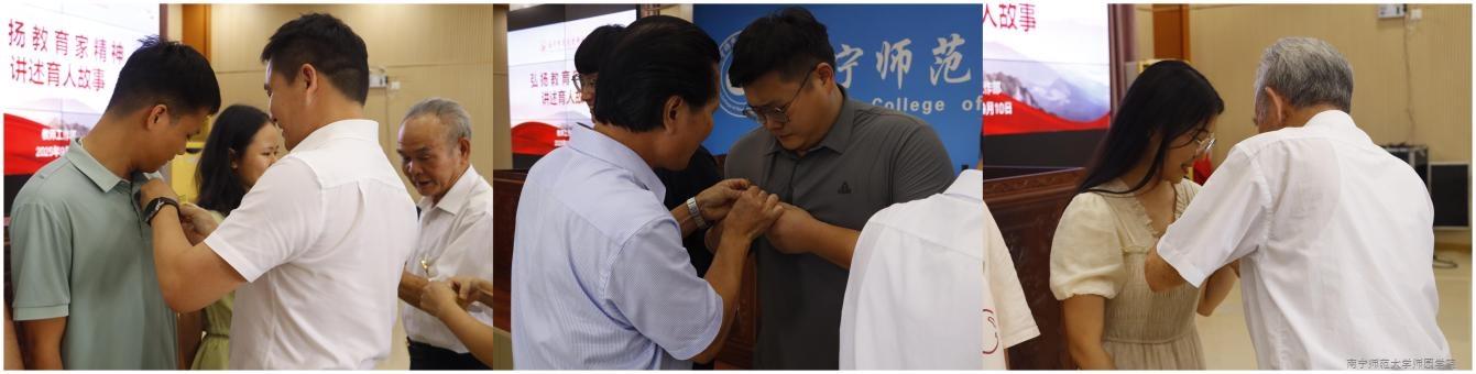 学校领导为新教师佩戴校徽
