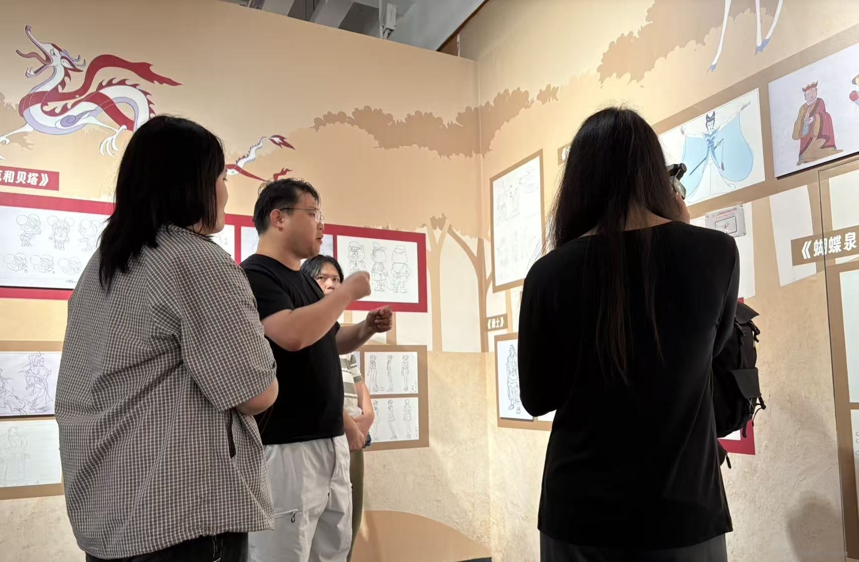 在动画经典回顾展中,上海美影厂的经典形象集合墙引发两班学子热烈讨论。韦慧媛老师引导大家分析展陈空间的光影运用与导视系统设计,启发不同年级学生共同思考传统元素的现代表达。同学们手持画板记录细节,从文物肌理到展陈布局,将所见所感转化为设计素材。