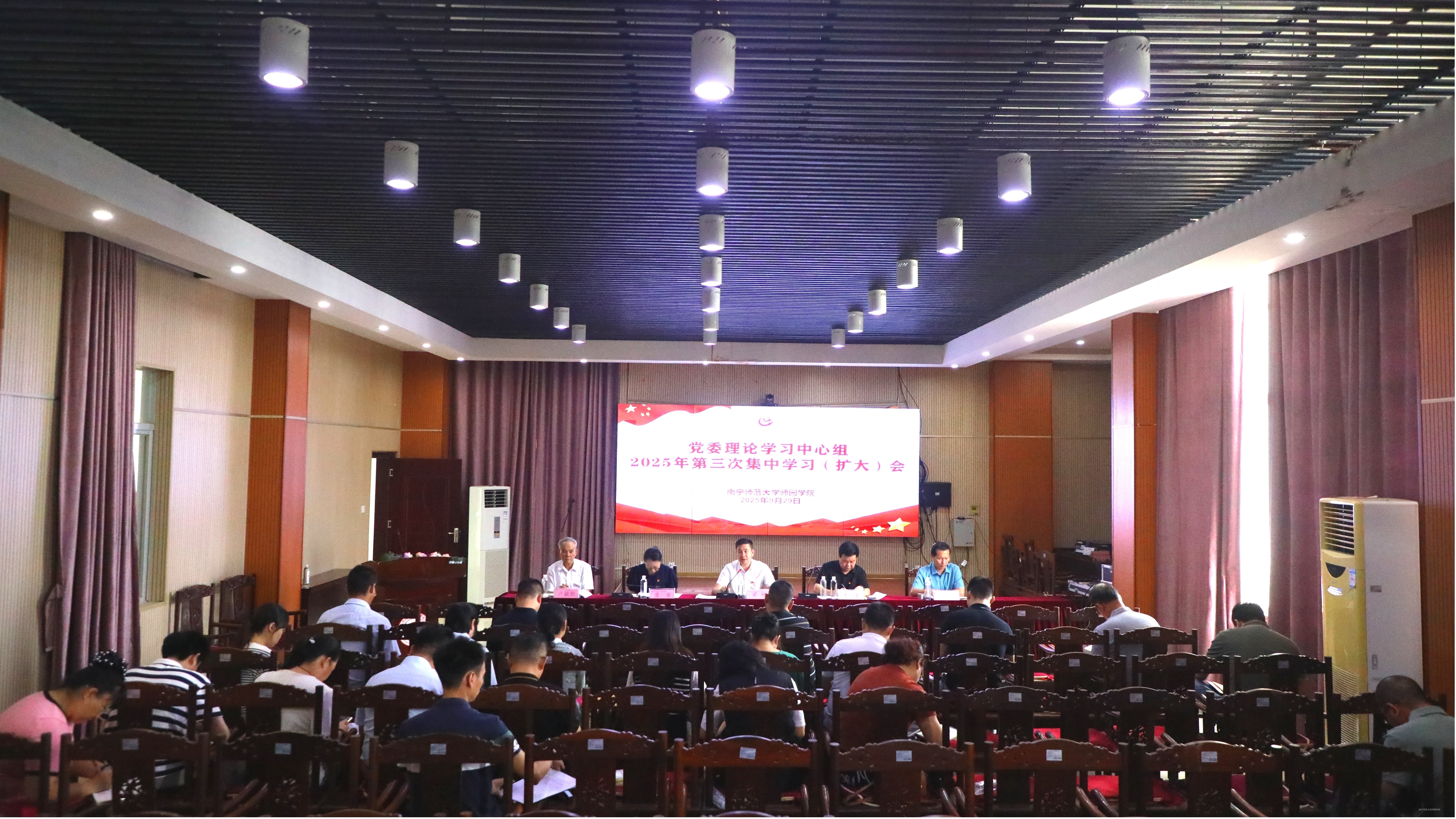9月29日上午,学校在行政综合楼第三会议室召开党委理论学习中心组2025年第三次集中学习(扩大)会议。学校党委副书记梁秋(主持党委工作),党委副书记、常务副校长李剑喜,纪委书记、副校长庞俊以及学校全体党委委员参加会议。 副校长李德正、教学总督导卢敏秋,各部门负责人,各党总支和各直属党支部书记列席会议。会议由庞俊副校长主持。