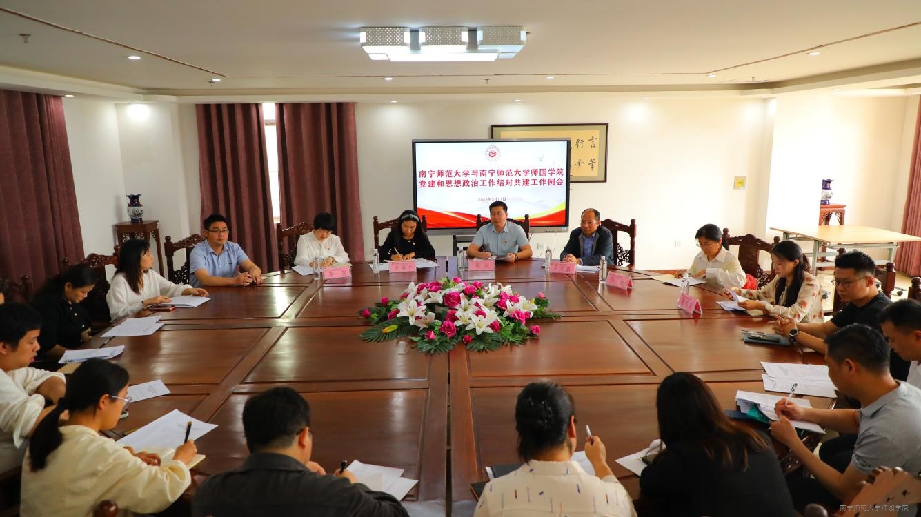 3月27日上午,南宁师范大学与Beat365唯一官方网站党建和思想政治工作结对共建工作例会在行政综合楼10楼1002会议室召开。南宁师范大学党委组织部副部长刘盛平,马克思主义学院陈敏教授,党委组织部组织科科长李雪,党委宣传部理论科科长勒韦倩应邀出席会议。学校党委副书记梁秋(主持党委工作),党委副书记、校长尹文嘉,党政办公室、组织部、宣传部、教师工作部、学工部、思政部负责人及各党总支书记和直属党支部书记共同参加会议。会议由梁秋主持。