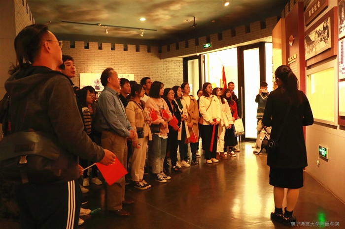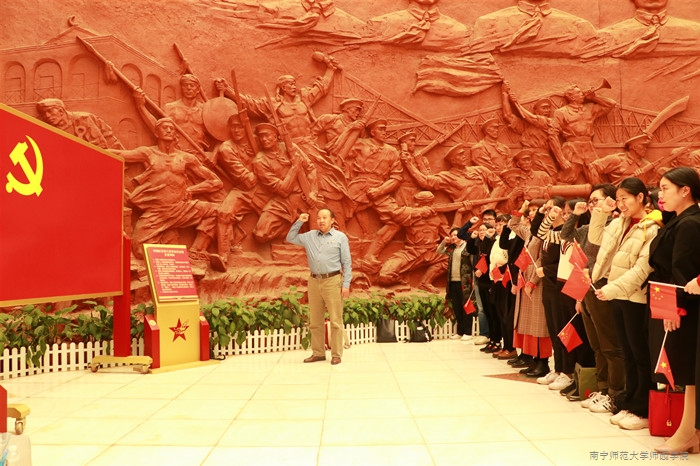 党员干部首先来到龙州起义纪念馆浮雕处,在讲解员介绍浮雕来历与内容后,学院党委书记梁春贤带领党员干部在党旗下重温了入党誓词。