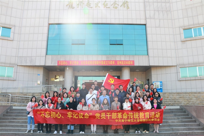 为进一步坚定我院党员干部的理想信念,提高党性修养,积极推进“不忘初心、牢记使命”主题教育,12月7日,学院党委书记梁春贤带领各党总支书记、党总支委员、党支部书记及学生党员代表共40余人赴龙州革命老区开展“不忘初心、牢记使命”主题教育现场学习活动。