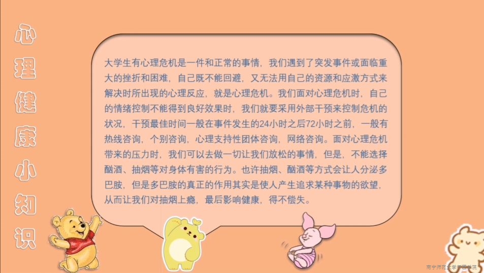 为加强我院学生对心理危机的了解,引导我院学生正确看待心理危机,提升应对心理危机的能力。6月18日,我院举行“百年党史育新人,奋发图强赋‘心’篇”心理危机应对图文小贴士大赛。